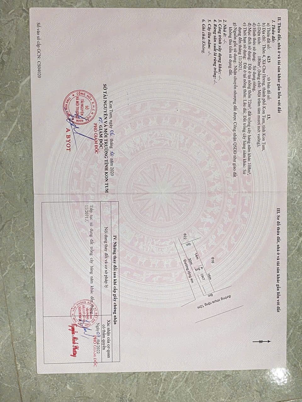 Bán đất Thôn 4, Xã Chư Hreng, TP Kon Tum. Giá: 800.000.000 VNĐ. Diện tích: 6m x 30m , TC: 72m2. Hướng: Đông Bắc. Mô tả: - Đất 2 mặt tiền đường, dân cư hiện hữu. - Cách UBND xã 1km; khu AB 2km. - Pháp lý rõ ràng. Liên hệ: 0947.585.124 (Hùng).