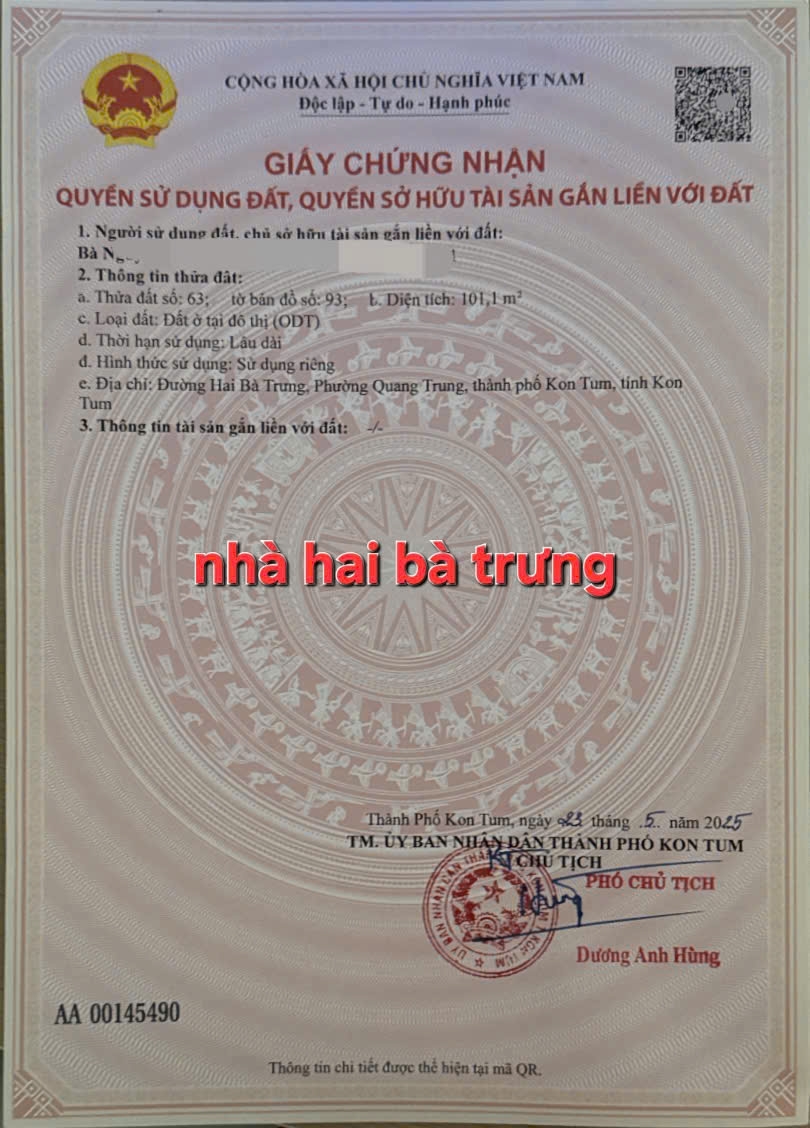 Bán nhà đường Hai Bà Trưng, P. Quang Trung, Tp. Kon Tum
